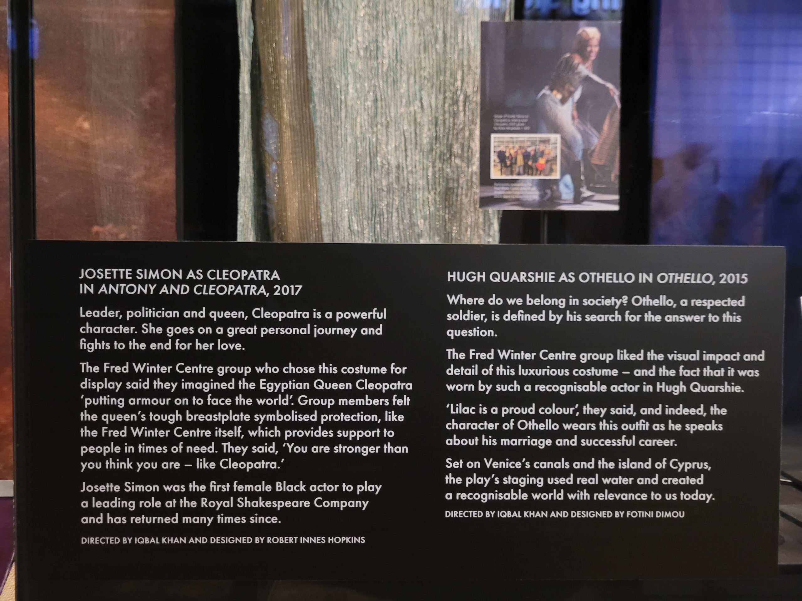 The Royal Shakespeare Company have a wonderful exhibition at the Swan Theatre in Stratford-upon-Avon, The Play’s The Thing, with a regularly-changing selection of costumes and props, plus stories from behind the scenes. I’ve written for this exhibition from the time it launched in 2018, weaving together details from the objects, the plays and the performances.