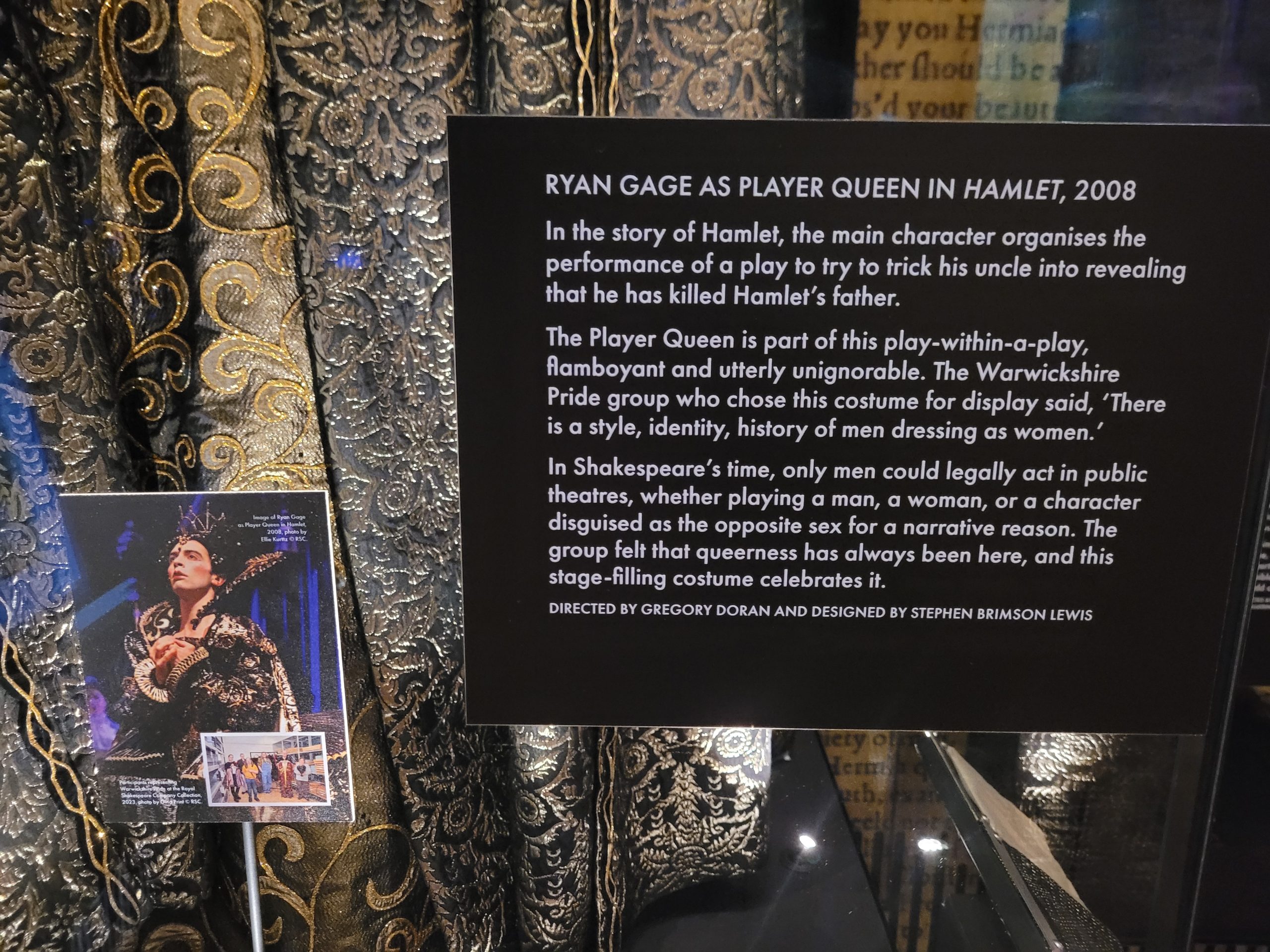 Institutions are designed to wield power, not to share it, and it is therefore no simple thing to co-curate successfully. The benefits, however, can be stunningly apparent. The diversity of costumes, characters and actors chosen by the co-curators is refreshingly inclusive of body size, skin tone and gender identity. A pretty dress might equally be worn by Juliette Stevenson playing Titania in A Midsummer Night’s Dream, as by Ryan Gage portraying Player Queen in Hamlet. As the Pride group said, queerness has always been here, and Gage’s sumptuous, stage-filling costume celebrates it.
